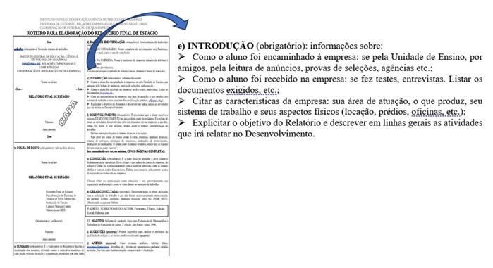 As recomendações descritas em quatro tópicos da introdução se voltam, de modo geral, para aspectos informacionais relativos ao processo de contratação do estudante – desde o encaminhamento do estagiário à empresa, até a natureza burocrática dos documentos exigidos. Além disso, são solicitadas descrições com foco na instituição contratante, tais como instalações, infraestrutura e área de atuação. Por fim, orienta-se o discente a explicar “o objetivo do relatório e descrever em linhas gerais as atividades” que serão relatadas no desenvolvimento.