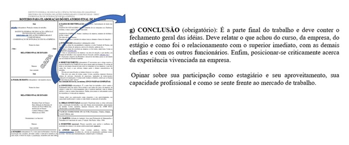 A última seção textual do relatório recebe o nome de “conclusão”, dada a natureza de fechamento do texto. Tal espaço, ao contrário da “introdução”, se volta para o encerramento do trabalho, retomando informações, situações, descrições e relatos que foram vistos no decorrer do relatório, com a finalidade de apontar possíveis constatações da experiência. Visto assim, podemos analisar as recomendações do Roteiro de produção (Figura 3).