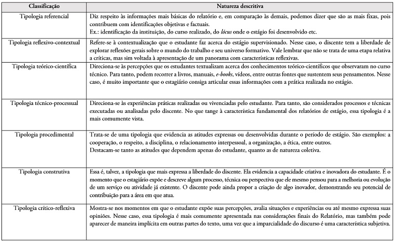 Partindo disso, elaboramos o Quadro 1 com o intuito de apresentar as referidas tipologias que tanto contribuem para que o conteúdo temático do relatório carregue a essência do gênero, mas também abranja outras dimensões formativas do estudante.