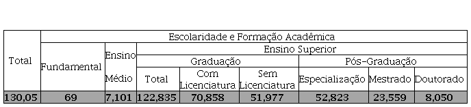 Sobre esse debate, Silva (2020, p. 73) destaca que “uma quantidade mínima dos docentes possui apenas Ensino Fundamental, 3,3% Ensino Médio, 39,4% Graduação e 57,3% Pós-graduação. Observa-se também que, dentre aqueles que possuem Graduação, 43,3% não possuem Licenciatura”. Segundo Silva (2020) haverá uma grande demanda por formação continuada de professores em razão do grande número da falta de escoloridade e formação adequada em nível superior (Quadro 1).