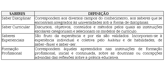 No Quadro 1, ficam explícitos os saberes dos professores classificados de modo organizado. Na prática docente, conforme Tardif (2000), esses saberes ficam como uma espécie de amálgama e misturam-se de modo a dar origem à práxis.