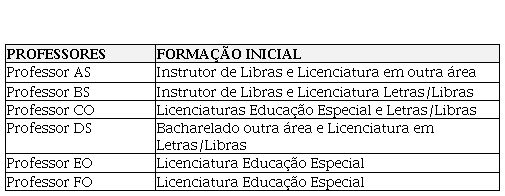 Professor FO - […] o Letras/Libras que é um curso completo que é uma formação de graduação quatro anos, que vai dar conta - eu não tenho essa formação - mas que vai dar conta da língua em si e da docência, eu acho. Não conheço a fundo o curso só aqui quando tinha as meninas que o fazem.
