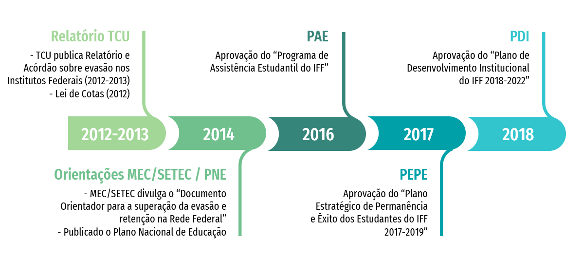 Em 2017 o IFF publicou o “Plano Estratégico de Permanência e Êxito dos Estudantes”, com vigência de 2017 a 2019, através da Resolução nº 23 do Conselho Superior (IFFLUMINENSE, 2017a). O plano foi elaborado como cumprimento de uma exigência do Tribunal de Contas da União, após um relatório de 2012 (BRASIL, 2012b) e um acórdão de 2013 (BRASIL, 2013), ambos resultantes de uma auditoria nos Institutos Federais de Educação, Ciência e Tecnologia.