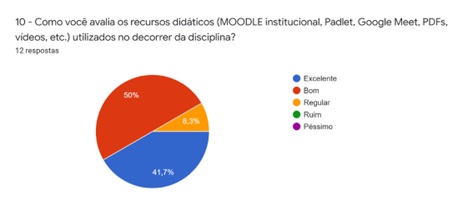 Os recursos didáticos utilizados na disciplina também foram avaliados. Porém, apesar do resultado mais positivo do que negativo, a pesquisadora entende que poderiam ter sido mais bem avaliados, pois alguns alunos relataram que tiveram dificuldades com o AVA Moodle em alguns momentos da disciplina, principalmente nas tarefas nas quais precisavam inserir arquivos na plataforma. Na percepção da tutora-pesquisadora, tais dificuldades dos alunos em relação ao Moodle vêm da pouca ou nenhuma experiência que eles têm com a utilização desse AVA, que apesar de ser apresentado em alguns trabalhos como sendo uma ferramenta intuitiva e de boa navegabilidade (FERNANDES, 2013; OLIVEIRA, 2019; PEDROZA, 2019; SANTOS; BALBINO; GOMES, 2015), apresenta alguns recursos que necessitam de um pouco mais de habilidade no seu uso. Por isso, sugere-se realizar uma ambientação antes de utilizar o AVA Moodle, a fim de diminuir os obstáculos em sua utilização.