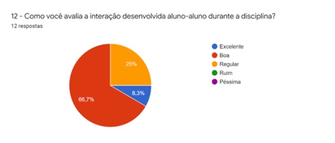 A décima primeira pergunta teve como objetivo que os alunos avaliassem a interação com a tutora durante a disciplina. Sobre isso, 11 alunos avaliaram como excelente tal interação e 1 aluno avaliou como boa. Além disso, os alunos avaliaram a interação entre aluno-aluno, através da décima segunda pergunta. Essa última foi avaliada como excelente por 1 aluno, 8 alunos avaliaram como boa e 3 alunos avaliaram como regular (Gráfico 3).