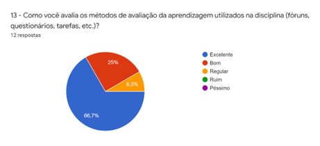 Na décima terceira pergunta, pediu-se aos alunos que avaliassem os métodos de avaliativos utilizados na disciplina, que foram os fóruns, tarefas, questionários, entre outros. 8 alunos avaliaram esses métodos como excelentes, 3 avaliaram como bons e 1 avaliou como regulares (Gráfico 4).