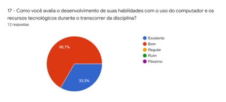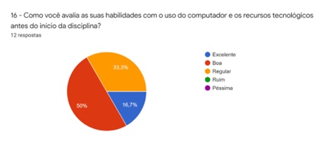 A décima sexta e décima sétima perguntas buscaram a avaliação dos alunos acerca das suas habilidades com o uso do computador e dos recursos tecnológicos antes e no decorrer da disciplina, respectivamente. Antes da disciplina, apenas 2 alunos avaliaram tais habilidades como excelentes, 6 alunos avaliaram como boas e 4 alunos como regulares, porém não houve respostas avaliando como ruins ou péssimas tais habilidades. No decorrer da disciplina, 4 alunos avaliaram como excelentes suas habilidades e 8 alunos como boas. Os resultados da décima sexta e décima sétima questões foram demonstrados nos Gráficos 5 e 6.