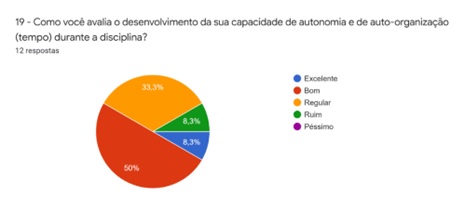 A pesquisadora considerou a autoavaliação dos alunos sobre a aprendizagem e o aproveitamento da disciplina como positiva, já que 91,7% dos respondentes avaliaram como excelentes ou bons a aprendizagem e o aproveitamento da disciplina, e ainda relacionou com a boa avaliação dos alunos em relação à disciplina no geral, demonstrada quando todos concordaram que ela ajudou na construção de novos conhecimentos ou no aprimoramento de conhecimentos prévios.