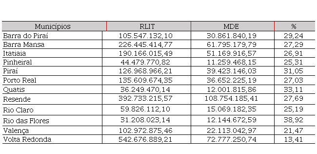 Na Tabela 1 são apresentados os municípios da região analisada seguidos da Receita Líquida de Impostos e Transferências (RLIT), do montante de despesas pagas em MDE e do percentual mínimo aplicado em MDE. É importante ressaltar que a RLIT é afetada negativamente, a depender dos generosos benefícios e incentivos fiscais concedidos às empresas, tais como: imunidade, isenção, anistia, remissão, renúncia e redução. Além disso, como destaca Julião (2021), a impossibilidade que os municípios enfrentam de se autogerirem com seus próprios tributos denota um centralismo fiscal no federalismo brasileiro que fortalece o ente nacional. É bem verdade que a instituição do sistema de transferências atenua tal dificuldade, mas não resolve o desequilíbrio financeiro entre as diferentes esferas de governo, mesmo porque os entes municipais acumulam muitas responsabilidades entre os demais entes federados (MASSARDI; ABRANTES, 2016).