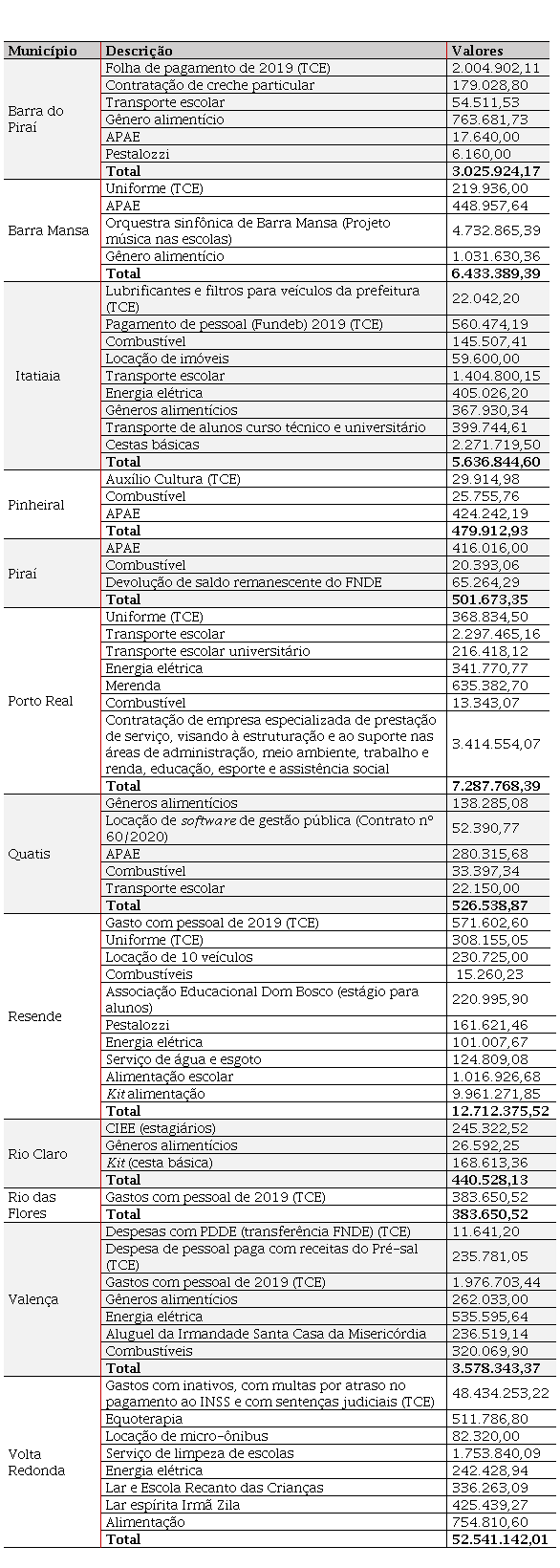 Em 2020, em um contexto de pandemia, a locação de imóveis foi uma despesa que apareceu em alguns governos municipais, embora o gasto não se justifique e também não atenda ao princípio do interesse público, de modo que os contratos poderiam ter sido rescindidos. Os governos de Itatiaia e Valença aplicaram receitas do percentual mínimo em ensino com tal despesa. Os pagamentos de despesas com energia elétrica também são duvidosos a depender do volume despendido, quando comparado com 2019, em que as unidades escolares funcionavam plenamente. O governo de Itatiaia pagou, em 2020, mais de R$ 405 mil e, em 2019, não houve pagamentos com energia elétrica com receitas do percentual mínimo do ensino. O governo de Porto Real pagou R$ 342 mil, em 2020, em energia elétrica e, em 2019, R$ 297 mil. O governo de Resende, em 2020, pagou mais de R$ 101 mil e, em 2019, R$ 981 mil; pagou também, com receitas do ensino, em 2020, R$ 125 mil com água e esgoto, sendo que, em 2019, a despesa foi de R$ 937 mil. O governo de Valença, em 2020, pagou R$ 536 mil com fornecimento de energia elétrica e, em 2019, R$ 594 mil. O governo de Volta Redonda pagou, em 2020, R$ 242 mil e, em 2019, R$ 838 mil. A despeito do governo de Valença que gastou quase o mesmo valor, os demais gastaram bem menos, em 2020, do que em 2019, com fornecimento de energia elétrica. Embora esse gasto possa estar sendo pago com outras fontes de receitas da educação, não é possível detectar exatamente tais pagamentos, pois não se tem acesso a todos os relatórios analíticos das despesas pagas com todas as receitas da educação, apenas das despesas do percentual mínimo para o ensino. Um exemplo foi o governo de Itatiaia que, embora tenha pago, em 2020, essa despesa com receitas do percentual mínimo, em 2019, não o fez, o que inviabilizou a comparação.