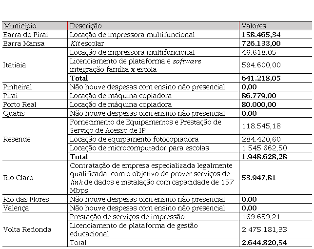 A despeito dos volumosos gastos ilegais e inadequados no contexto de pandemia, o ensino não presencial não gozou de tanta prioridade. Dos 12 governos municipais, não foi detectado nenhum tipo de investimento em ensino não presencial, sobretudo em ensino remoto pelos governos de Pinheiral, Quatis, Rio das Flores e Valença. Dos governos que investiram, a maioria optou por locação de impressoras. Esta pesquisa considerou as despesas com kit escolar, pois muitos, embora já sejam disponibilizados em outros anos pelas prefeituras, colaboraram para o ensino não presencial, em 2020. Algumas despesas podem não ter sido empenhadas devido à pandemia ou para fomentar o ensino não presencial, mas foram consideradas, pois poderiam colaborar com sua implementação.