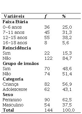 Segundo as análises dos 144 prontuários, a maioria dos casos de acolhimentos foi na faixa etária de 12 a 15 anos (38,2%) e de crianças (56,9%). Além disso, 51,4% dos casos não incluem grupo de irmãos, e, em relação ao sexo, a maioria dos acolhimentos é de meninas, com 62,5% dos casos. Esses resultados são semelhantes aos encontrados no estudo de Corrêa et al. (2020), em que a maioria dos acolhimentos foi para o sexo feminino (58,7%) e a média de idade foi de 13 e 15 anos. Em estudo com dados nacionais, os resultados da presente pesquisa não convergem com os apresentados pelo Relatório do Sistema Nacional de Adoção e Acolhimento (BRASIL, 2020), no qual houve certo equilíbrio na distribuição de meninos (51%) e meninas (49%). Na Tabela 1 encontram-se os dados do perfil de acolhimento realizado pela instituição.