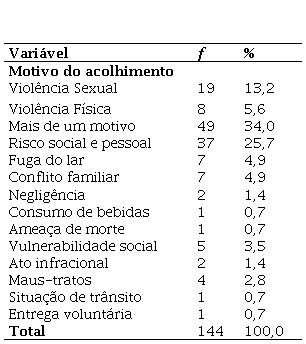 Quanto ao motivo do acolhimento (Tabela 2), identifica-se que para 34% dos casos, o Conselho Tutelar apresenta como justifica para o acolhimento mais de um motivo, seguido de 25,7% dos casos em que o motivo do acolhimento foi o risco social e pessoal. Destaca-se entre o conjunto de violações reunidas na categoria “mais de um motivo”: 1) Situação de risco pessoal e social e suspeita de violência sexual, 2) Fuga do lar e situação de risco, 3) Fuga do lar e conflito familiar e 4) Negligência e abandono de incapaz (as crianças estavam sozinhas em casa).