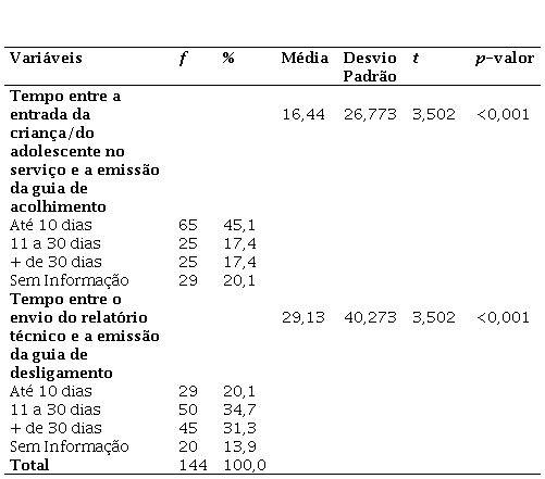 Quanto à análise de dados, estes foram analisados por meio do software Statistical Package for the Social Sciences (versão 20.0). Análises descritivas como frequências e medidas de tendência central foram realizadas para identificar o perfil dos acolhidos (motivo do acolhimento, faixa etária, sexo, criança ou adolescente; se era reingresso e se compunha grupo de irmãos). Para análise comparativa da média de tempo entre a entrada da criança/do adolescente no serviço e a emissão da guia de acolhimento, e da média de tempo entre o encaminhamento do relatório técnico para o judiciário (Fórum e MP) e a emissão da guia de desligamento, foi realizado o teste t pareado, considerando-se o nível de significância estatística em p<0,05. Tal teste paramétrico foi selecionado a partir do resultado do teste de Kolmogorov-Smirnov, o qual apontou que a amostra tem uma distribuição normal. Os dados do diário de campo foram discutidos de forma integrada aos resultados estatísticos apresentados.