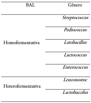 Treze gêneros de microrganismos integram esse grupo: Carnobacterium, Enterococcus, Lactococcus, Lactobacillus, Lactosphaera, Leuconostoc, Oenococcus, Pediococcus, Streptococcus, Vagococcus. Weissella. Além disso, são classificadas de acordo com suas características intrínsecas de metabolização do carboidrato. As BAL podem ser diferenciadas em homofermentativas, dada a produção exclusiva de ácido lático, e em heterofermentativas, quando produzem, além de ácido lático, diacetil, dióxido de carbono e etanol (JAY, 2013; MOGENSEN et al., 2003).