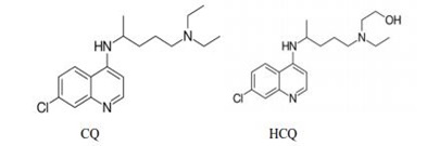 Fato é que todos esses acontecimentos descritos passaram a movimentar bastante a comunidade científica na busca de um tratamento curativo eficaz. Nesse contexto, desde o início da pandemia muito se discutiu o papel do fármaco cloroquina e de seu análogo, a hidroxicloroquina, para o tratamento da covid-19. As estruturas químicas dos dois fármacos (CQ e HCQ) são mostradas na Figura 3.