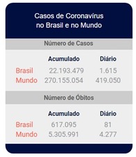 De acordo com os dados da DASA ANALYTICS, 2021, em 13 de dezembro de 2021 já se registravam 270.155.054 de casos acumulados e confirmados de coronavírus e 5.305.991 óbitos em todo o mundo, e 22.193.479 casos e 617.095 óbitos no Brasil (Figura 2).