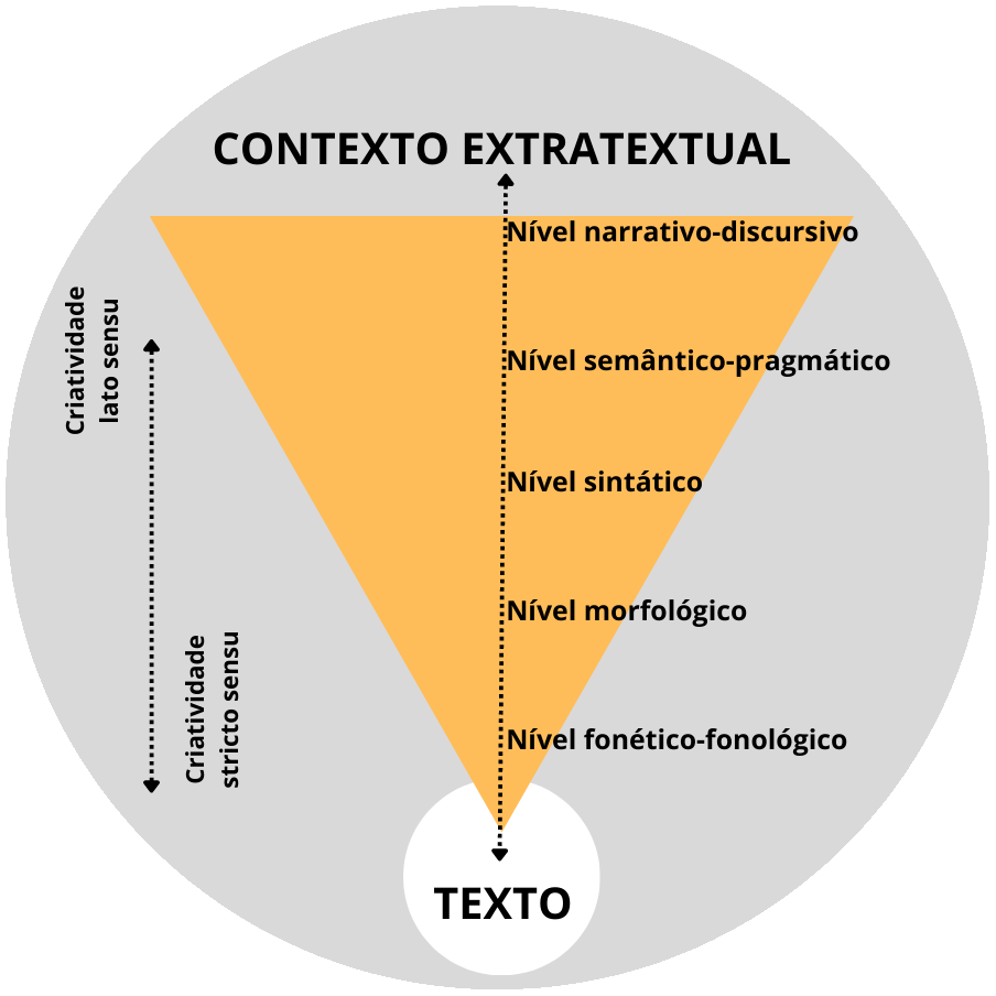 Está exposta na Figura 1 uma proposta preliminar de visualização da relação criatividade-texto. O círculo cinza representa a criatividade lato sensu, no qual obrigatoriamente se insere toda materialidade textual, isto é, todo texto oral ou escrito é produto da criatividade humana em sentido amplo, conforme atribuído pelos teóricos da psicologia, como Alencar e Fleith (2003). O círculo branco é o processo-produto do uso dessa capacidade humana abstrata, que potencialmente poderia ser realizada em linguagem diferente da verbal, como os gestuais, na expressão corporal, no desenho etc. O círculo branco é, portanto, o texto construído. O triângulo laranja – ou “funil” – simboliza a penetração da criatividade lato sensu na língua, atravessando os níveis linguísticos e atingindo a superfície textual, lugar em que se realiza a criatividade (linguística) stricto sensu.