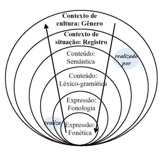 O nível narrativo-discursivo, por se aproximar mais nitidamente do campo das ideias, reside no limiar entre o texto e o mundo. O nível fonético-fonológico, por outro lado, lida com as unidades mínimas da linguagem verbal: as sílabas e os fonemas, que são “a menor unidade destituída de sentido, passível de delimitação na cadeira da fala” (DUBOIS et al., 2014, p. 260), e os fones, “cada uma das realizações concretas de um fonema” (DUBOIS et al., 2014, p. 260). Os níveis gramaticais da língua se ampliam a partir do fonético-fonológico. O morfema, unidade de análise por excelência da morfologia, é o “menor elemento significativo individualizado num enunciado, que não se pode dividir em unidades menores sem passar ao nível fonológico” (DUBOIS et al., 2014, p. 389). O nível sintático, responsável pela “combinação na cadeira da fala” (DUBOIS et al., 2014, p. 520), lida com sintagmas, frases e períodos. O nível semântico-pragmático, por lidar com os significados, avança sobre o uso da língua, a cultura e caminha rumo ao contexto extratextual. Na Figura 1 está demonstrada uma percepção de estruturação da língua que não é nova e se encontra, por exemplo, na Linguística Sistêmico-Funcional, conforme observamos ao compará-la com a Figura 2.