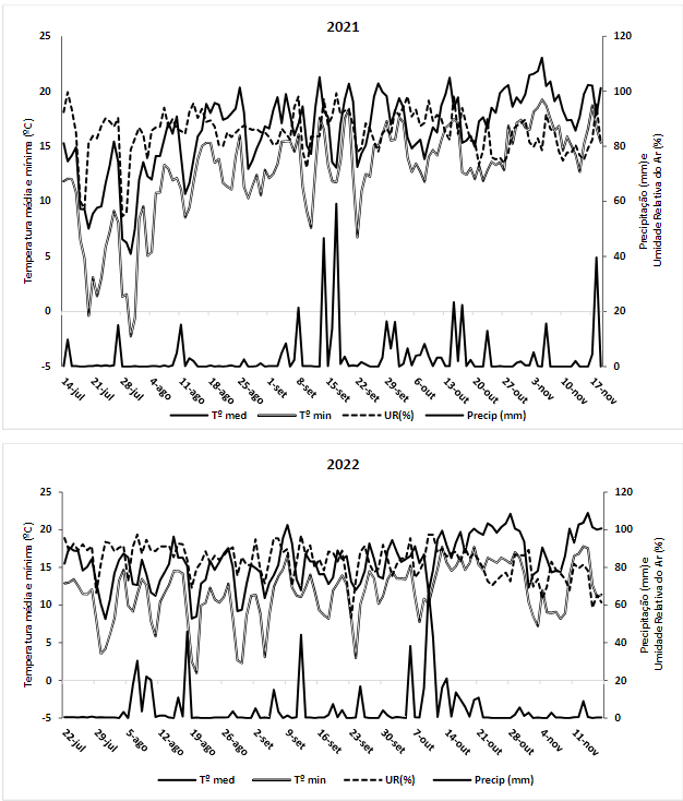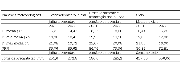 Durante os experimentos de 2021 e 2022, registraram-se na Estação Meteorológica da EE de Ituporanga da Epagri as variáveis meteorológicas para os distintos períodos de desenvolvimento da cebola (Tabela 2; Figura 1).