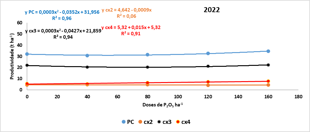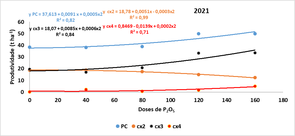 Em 2021, a produtividade comercial (PC) máxima média de 51,00 t ha-1 foi obtida com as doses de 120 e 160 kg P2O5 ha-1, com tendência de incremento conforme o aumento da dose do fertilizante fosfatado (Figura 2). Inicialmente, o solo escolhido para o trabalho apresentava teor baixo de fósforo (5,9 mg dm-3), devido ao pH baixo (5,5) e acidez potencial (6,9 cmolc dm-3), optou-se pela calagem. Ela aumentou a soma de bases e elevou os teores de fósforo no solo para alto (CQFS RS/SC, 2016). Devido a isso, a dose de 120 kg P2O5 ha-1 foi suficiente para o aumento da produtividade em níveis similares a dose de 160 kg P2O5 ha-1.