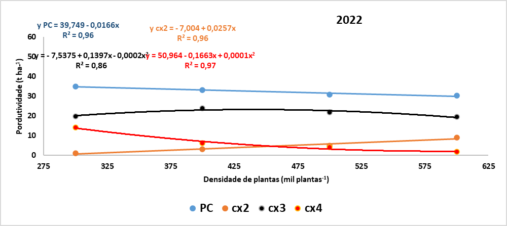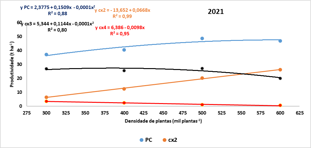 Em 2021, houve a tendência de aumento da PC e cx2, e a redução de cx3 e cx4 com o aumento do número de plantas por hectare. Por sua vez, em 2022, um ano de menor produtividade, observou-se uma redução da produtividade PC, da cx3 (a partir de 450 mil plantas ha-1) e da cx4, e aumento da cx2 com o aumento da densidade populacional.