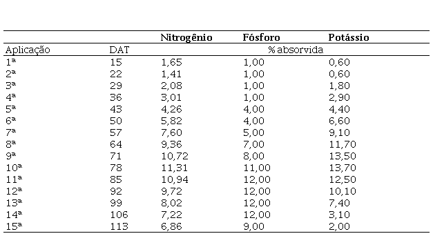As doses de nitrogênio (150 kg N ha-1) e potássio (105 kg K2O ha-1) foram fornecidas semanalmente conforme a curva de absorção dos nutrientes para cultivares de ciclo precoce (KURTZ et al., 2016) (Tabela 1). Utilizaram-se como fontes de fósforo, nitrogênio e potássio, os fertilizantes fosfato monopotássico, nitrato de amônio e cloreto de potássio, respectivamente.