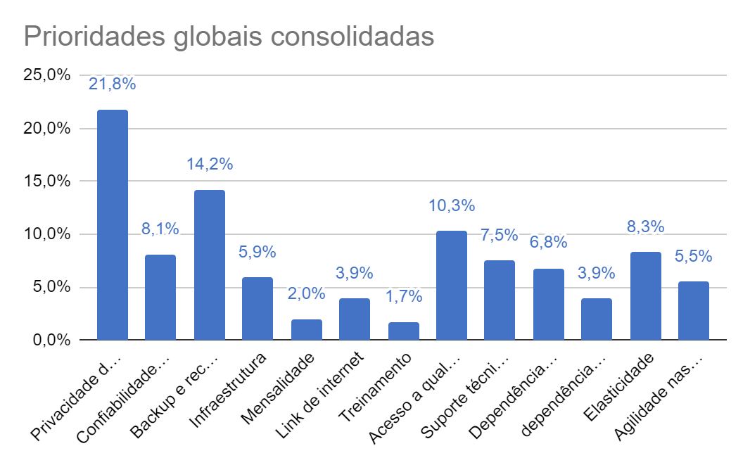 Nas prioridades globais, destaca-se que a privacidade dos dados é o fator mais relevante para o objetivo geral, representando 21,8%; e o segundo fator é o backup e recuperação de dados com 14,2%. Ambos estão diretamente relacionados ao critério segurança. O terceiro elemento mais importante, com 10,3%, é o acesso a qualquer hora, lugar e dispositivo referente a alta disponibilidade, seguido da elasticidade com 8,3%, que está associado ao critério escalabilidade. As prioridades globais são apresentadas na Figura 9.