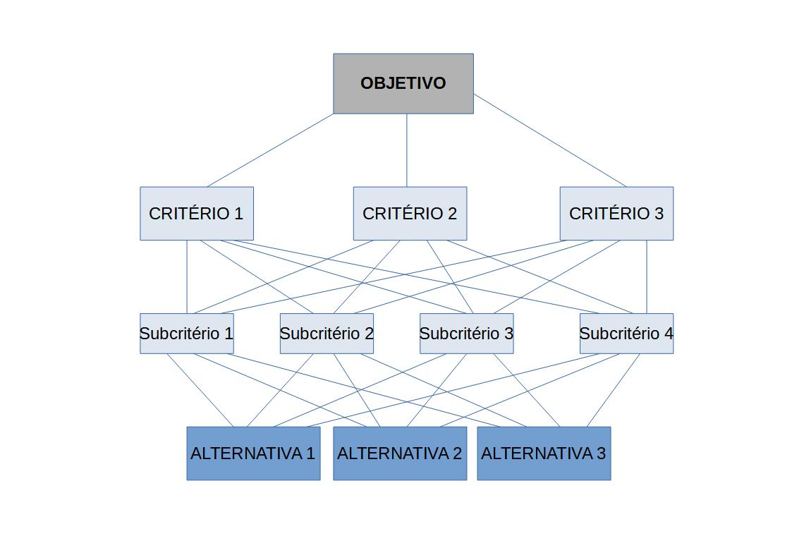 Segundo Zayat et al. (2023), o método AHP foi desenvolvido por Saaty (1988) e faz parte do grupo de métodos de tomadas de decisão baseados em comparação entre pares, sendo considerado o método mais popular dessa classe. Consiste em tratar o problema considerando a hierarquia, com o objetivo no topo, seguido pelos critérios e subcritérios no meio e as alternativas na parte inferior (Figura 3).