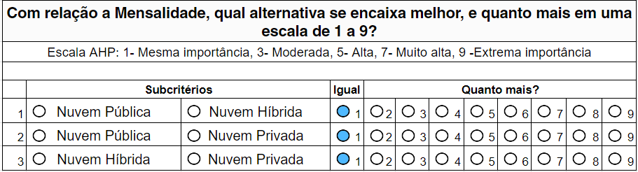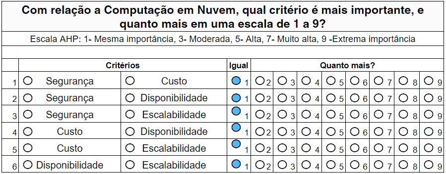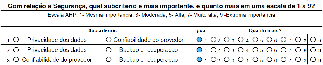 Essa comparação é feita por meio de um questionário com perguntas estruturadas da seguinte forma: Com relação ao <critério X>, qual subcritério é mais importante e quanto mais em uma escala de 1 a 9? O entrevistado deve selecionar o critério e a escala binária de comparação do método AHP, em que, conforme Saaty (1988):