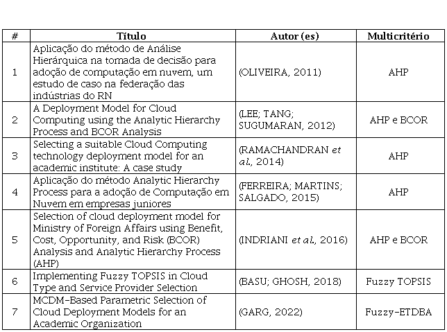 Para definir os critérios e subcritérios, realizou-se uma pesquisa bibliográfica nas bases de dados Scopus e Google Acadêmico, utilizando as palavras-chave: computação em nuvem, multicritério e modelo de implantação que retornou publicações relevantes acerca do tema. Foram selecionados sete trabalhos que utilizam métodos multicritério para tomada de decisão sobre modelo de implantação de computação em nuvem, conforme o Quadro 1.