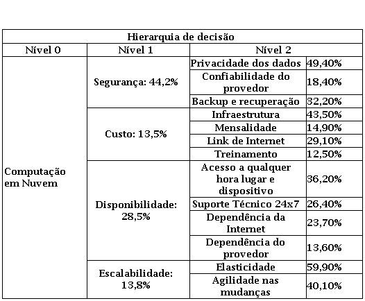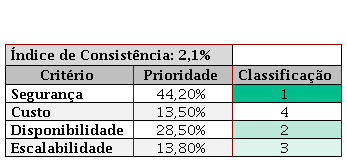 Outros autores chegaram a resultados distintos. Ramachandran et al. (2014) selecionaram a nuvem privada em uma instituição acadêmica, porque acreditavam que proporciona maior economia de custos, além de prover a segurança necessária para manter informações confidenciais, tais como detalhes dos estudantes, notas, entre outros. No presente artigo, o critério segurança também foi considerado o de maior peso na tomada de decisão, sendo o subcritério privacidade dos dados o de maior prioridade global da hierarquia; porém a equipe avaliadora considerou, ao contrário dos autores, a nuvem híbrida como ideal para esse subcritério.