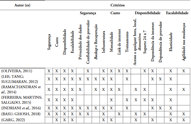 Já Basu e Ghosh (2018) aplicam o método TOPSIS (Technique for Order of Preferences by Similarity to Ideal Solutions) para descobrir o melhor fornecedor de serviços e escolher o modelo de implantação de acordo com requisitos.