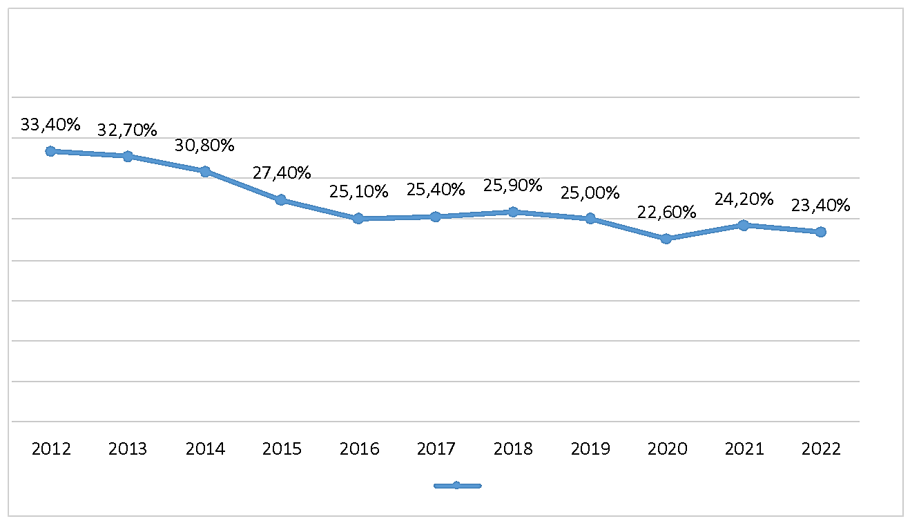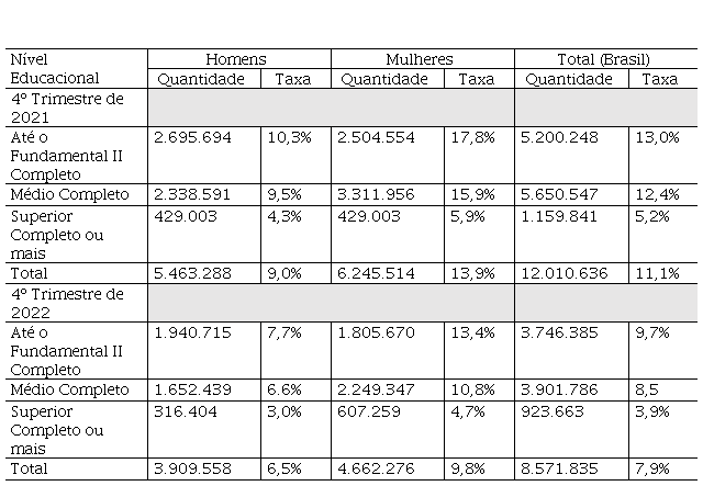 A pandemia de covid-19 não apenas interrompeu a trajetória ascendente de participação das mulheres no mercado de trabalho, notadamente a partir de 2012 com 51,4%, mas também a diminuiu no 4º trimestre de 2022 com 52,7% em comparação com os 54,3% do 4º trimestre de 2019. Por outro lado, a participação dos homens nos mesmos recortes de tempo, além de permanecer maior (72,1% no 4º trimestre de 2022), voltou para sua tendência após a pandemia com 72,1%, enquanto a das mulheres caiu 1,6 p.p., no mesmo período. No que tange ao recorte por escolaridade, também se revela uma expressiva desigualdade (Tabela 1).
