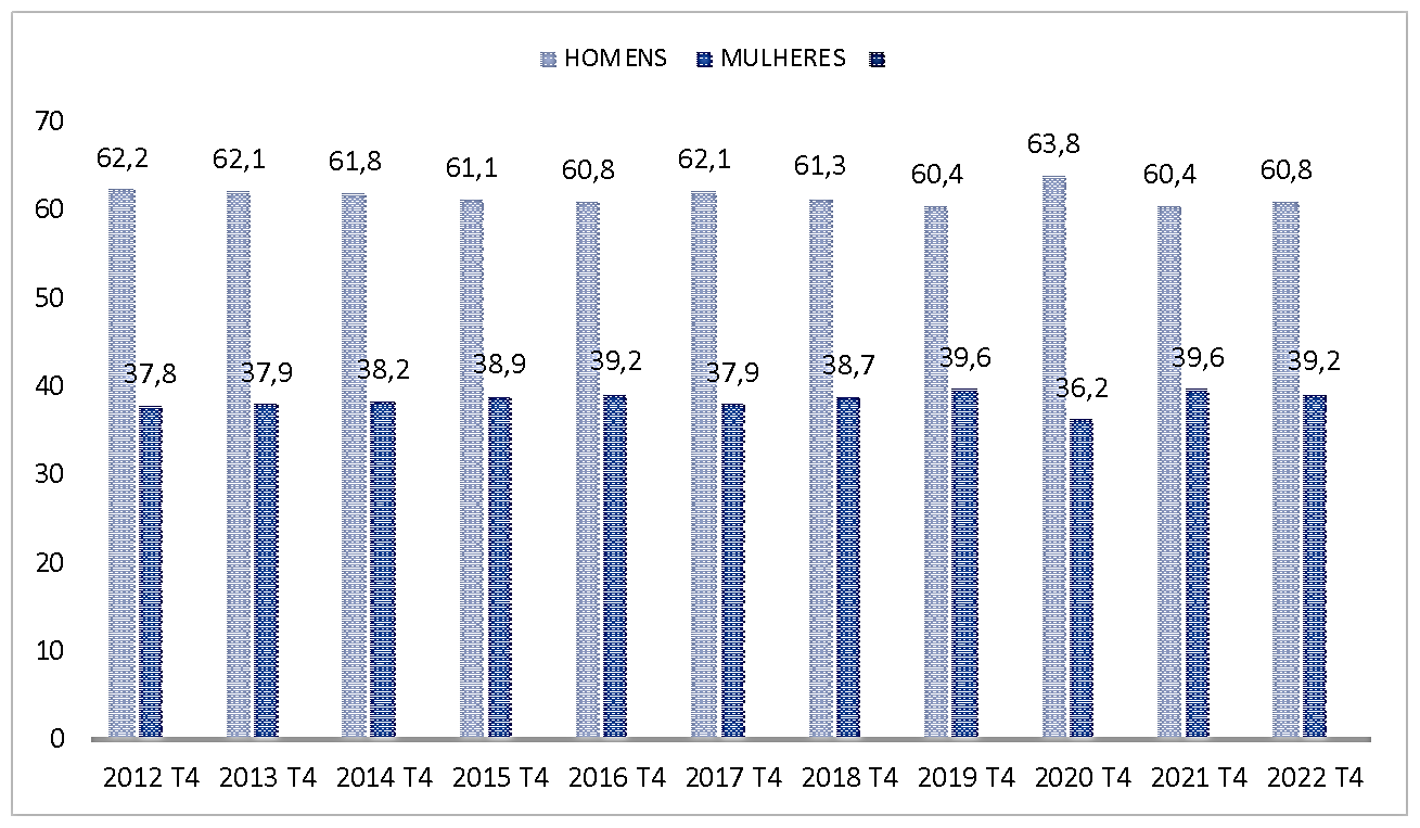Conforme demonstrado no Gráfico 1, a taxa de desemprego é maior entre aqueles e aquelas que têm até o Fundamental 2 e o Ensino Médio, ainda que completos. Porém, as taxas de desemprego no recorte do nível educacional são maiores entre as mulheres do que entre os homens, independentemente do nível de escolaridade analisado, sendo que dos 8,6 milhões de indivíduos desocupados, 54,4% são mulheres. Não bastasse isso, a remuneração média dos homens, no período do 4º trimestre de 2022 foi 28,3% acima da remuneração média das mulheres, a saber, R$ 3.099, 00 e R$2.416,00, respectivamente. Para além desse dado, o estudo aponta que, segundo os microdados da Pnad Contínua 2021, na última década, ainda que a lacuna salarial entre homens e mulheres tenha diminuído aproximadamente 10 p.p. (era 33,4% no 4º trimestre de 2012 e fechou em 23,4% no 4º trimestre de 2022), ela continua muito expressiva, mesmo quando se comparam pessoas cujas formações, responsabilidades e atribuições no mundo do trabalho são semelhantes (FEIJÓ, 2023). No Gráfico 1 está demonstrado o quanto percentualmente os homens recebem a mais do que as mulheres que fazem parte do mesmo grupo produtivo.