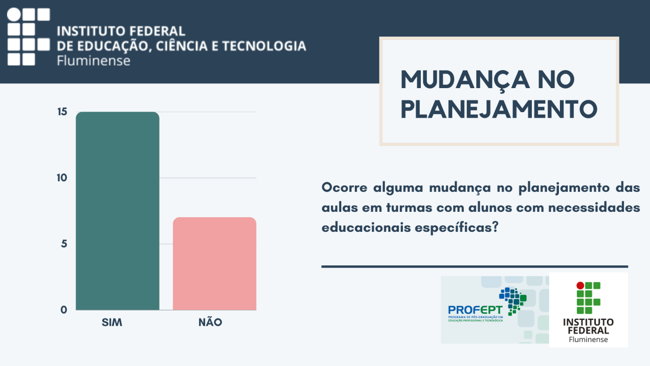 Haja vista o planejamento didático-pedagógico, verificou-se que a maioria dos docentes realiza mudanças no planejamento das aulas para atender as demandas dos alunos com necessidades educacionais específicas. Com ênfase para a adaptação do processo avaliativo e da elaboração dos materiais didáticos.