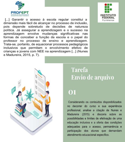 Abstract: The purpose of this article is to analyze the results from the application of the educational product, continuing education course, in the Education at a Distance modality, called: Introduction to Inclusion and Pedagogical Accessibility. The educational product is linked to the dissertation developed under the Graduate Program in technical and vocational education and training – ProfEPT. The methodological path of this study used the qualitative approach. Regarding the nature and objectives, it is classified as an applied research, of an exploratory and descriptive nature, using the procedures of bibliographic and documentary research. Fifteen teachers were certified, through the Reference Center for Technology, Information and Communication in Education of IFFluminense, for their participation in the Introduction to Inclusion and Pedagogical Accessibility course. The results of the bibliographic and documentary research obtained from the application of data collection instruments corroborated the need for actions aimed at continuing teacher education, with a view to the implementation of an inclusive education.