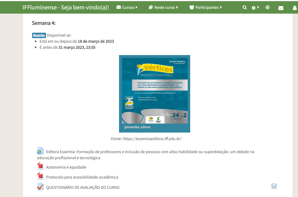 Na quarta semana de aplicação do produto educacional foram abordadas as temáticas referentes à formação docente e inclusão e a aplicação do instrumento de coleta de dados, Questionário de Avaliação do Curso. Na Figura 11, apresenta-se a página da última semana do curso no Moodle do IFFluminense.
