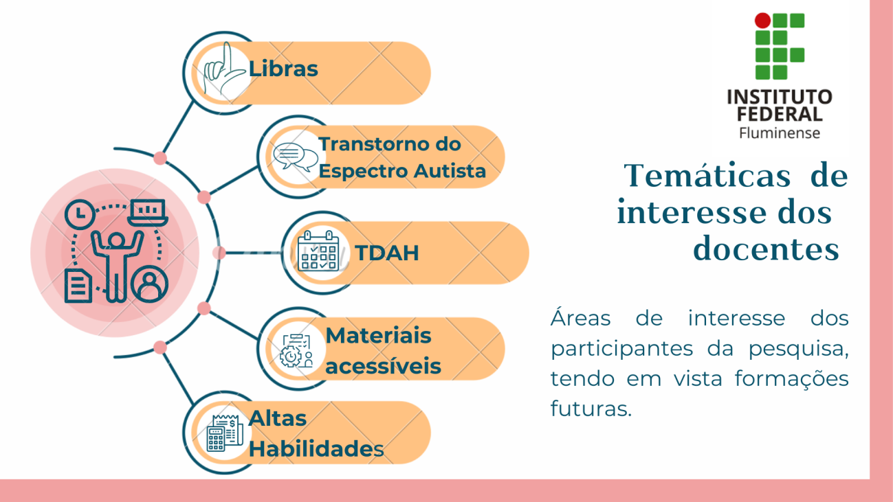 Quanto aos docentes que já haviam realizado cursos na área da educação inclusiva, destaca-se a temática da Língua Brasileira de Sinais – Libras. Esse resultado coaduna com a Resolução nº 33/2018 (IFFLUMINENSE, 2018), que estabelece o Programa de Acessibilidade Educacional do Instituto Federal Fluminense, “Deve-se garantir com o programa de capacitação um mínimo de cinco por cento do total de servidores, funcionários e empregados da Instituição capacitados para o uso de Libras (BRASIL, 2005), além de alunos e público externo.” (IFFLUMINENSE, 2018, p. 34).