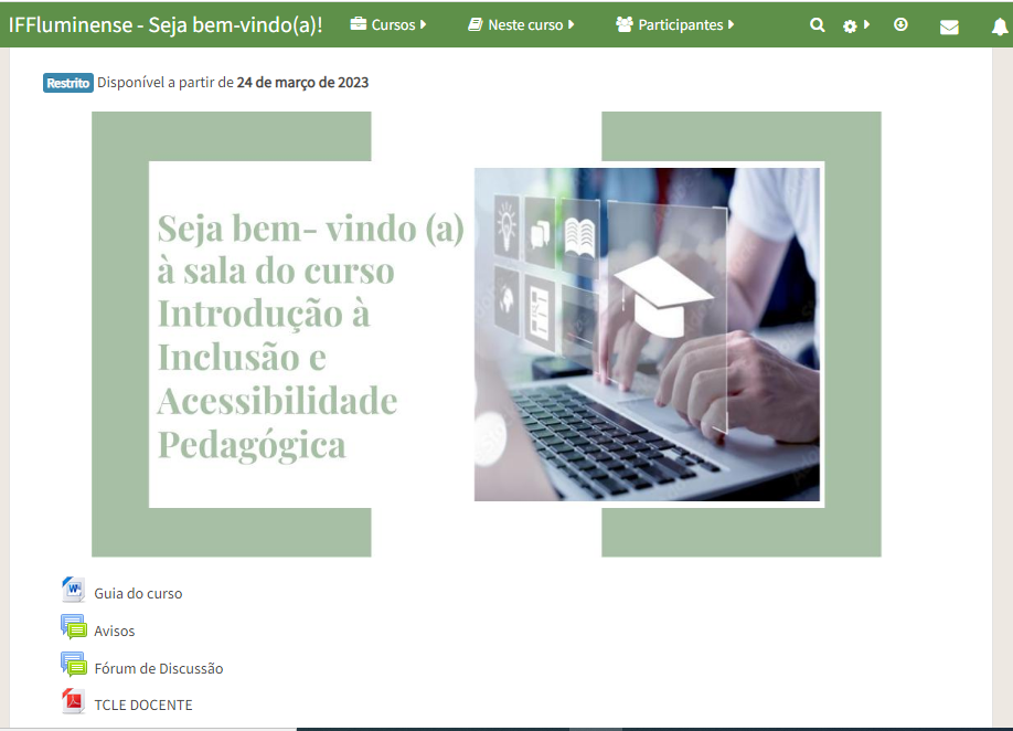 Foram efetivadas trinta e nove inscrições no curso, após análise do público-alvo. Na Figura 1, apresenta-se a página inicial do curso na plataforma de educação a distância do IFFluminense (https://ead2.iff.edu.br).