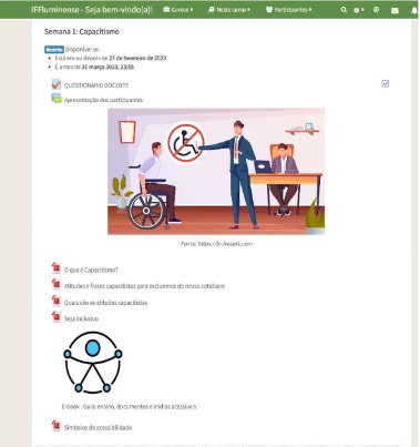 A carga horária, 40 horas, foi distribuída em quatro semanas, posteriormente, prorrogada por mais uma semana atendendo a solicitação dos docentes. Na Figura 2, apresenta-se a primeira semana do curso no ambiente virtual de aprendizagem.