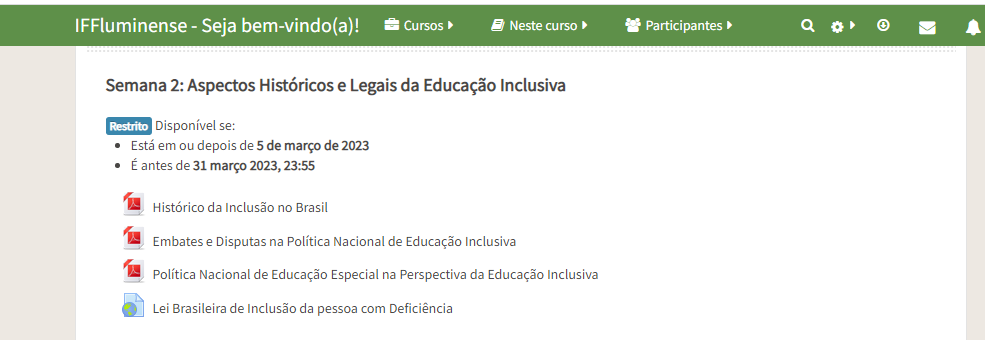 Na segunda semana de aplicação do curso foram apresentados os aspectos históricos e legais da educação inclusiva (Figura 5).