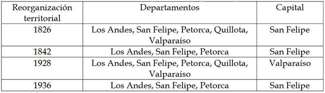 Para entonces, Aconcagua se erige como unidad política administrativa incluyendo en su composición a los Departamentos de San Felipe, Los Andes, Petorca, Quillota y Valparaíso. Posee una extensión posible de determinar “desde la orilla sur del río Choapa hasta la cuesta de Chacabuco, y su cordón de montañas hasta el mar” (Letelier, 1889, p.243). La capital será la ciudad de San Felipe en desmedro de las pretensiones de Valparaíso. Ello, pues dicha ciudad a priori -y la proyección realizada junto a Quillota y Casablanca - y bajos consideraciones de seguridad nacional, “no tiene aptitudes de por sí, y defraudaría enormemente las de la provincia a que ha sido enumerado” (Sesión Legislativa Nº442. 9 de agosto de 1826). Es decidor que desde la década de 1820 Valparaíso exija constituirse como provincia autónoma con estatus de capital por sobre el resto de los Departamentos (Sanhueza, 2008: p.447-493). Sin embargo, también lo es el hecho de que sólo en 1842 logre materializar su provincia autónoma, cuando la nación alcanza un escenario de calma tras el conflicto con los Gobiernos vecinos.