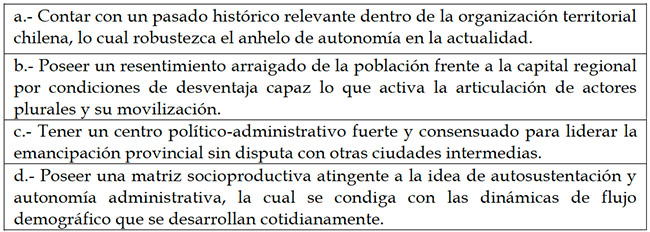 Tal reclamación es un aspecto importante dentro de la problemática de nuestro estudio, en tanto, resitúa los alcances que Aconcagua posee y/o debiese representar como unidad. Principalmente, si se considera que dentro de los argumentos referidos para fundamentar la proyección regional se alude a cuestiones de índole histórica, política, cultural e identitaria. A nivel nacional, hemos sido testigos de situaciones similares, tal es el caso de los territorios que demandaron ser región autónoma en 2007 (Arica y Parinacota; y Los Ríos) y 2017 (Ñuble), mientras que la ausencia de factores constitutivos de la demanda así lo demuestran en aquellos casos que han fallado en su anhelo: Maule Sur y Choapa- Limarí. Aconcagua, en tanto, posibilita un análisis intermedio facilitado por la vigencia de su demanda, empero, sin lograr materializar su anhelo. Con un estudio de factibilidad económica en marcha, su proyección y consideración, lejos de estar zanjada, se encuentra en entredicho a través de un debate soterrado que no logra consenso dentro de sus principales promotores, teniendo, además, importantes matices -con aquellos casos que lograron ser región- referenciados en la matriz estructural de la demanda, motivo que insta su comparación con las experiencias de Arica, Valdivia y Chillán, en tanto también aludieron a un pasado histórico importante dentro del territorio, con protagonismo y raigambre dentro del espacio local.
