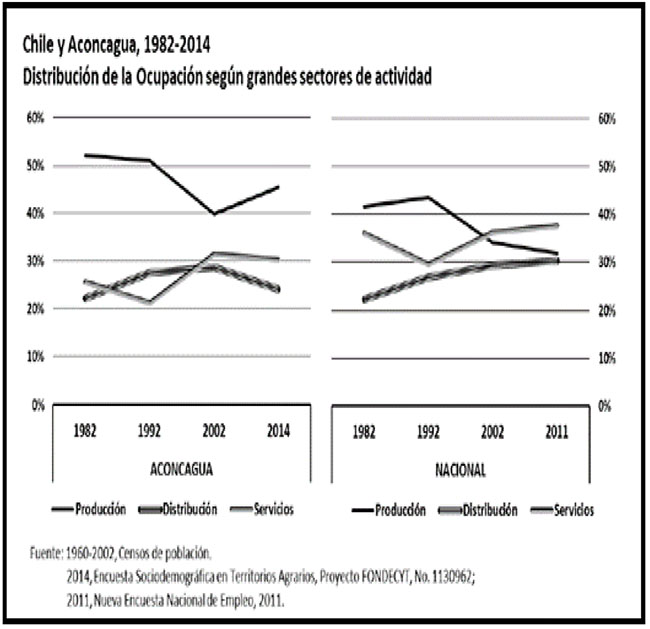 Una demostración de ello es el predominio de la actividad productiva primaria frente al área de servicios durante el período 1984 y 2014 -situación contraria al contexto nacional, como también lo es el flujo de trabajadores que diariamente se traslada desde una comuna a otra -dentro de las dos provincias-, alcanzando un 20% del total de la fuerza laboral, lo que solo es superado por Santiago (62%), Concepción (38%) y Valparaíso (27%) (Canales, A. y Canales, M., 2017: p.165).