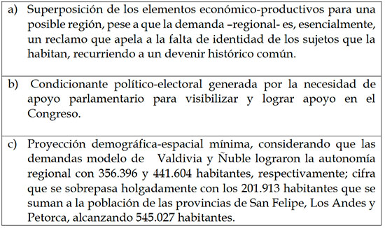 -La proyección regional de Aconcagua, si bien ha logrado captar la atención de las autoridades competentes, presenta elementos aún no resueltos, los cuales en base a casos exitosos que lograron forjar su región autónoma, revisten una importancia central en su proyección y materialización. Estos son: apoyo político real de sus representantes parlamentarios, principalmente, de senadores, pese a ciertas alegorías de los senadores Ricardo Lagos Weber (PPD) y Francisco Chahuán (RN); creación de un bloque sociopolítico transversal, con participación real y efectiva del empresariado local; definición de su capital regional y; quizás la más importante, indefinición respecto de sus alcances, toda vez que las consideraciones geográficas, identitarias, políticas y técnicas, nuevamente intentan zanjar una unidad territorial bajo el nombre de Aconcagua.