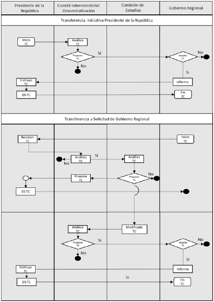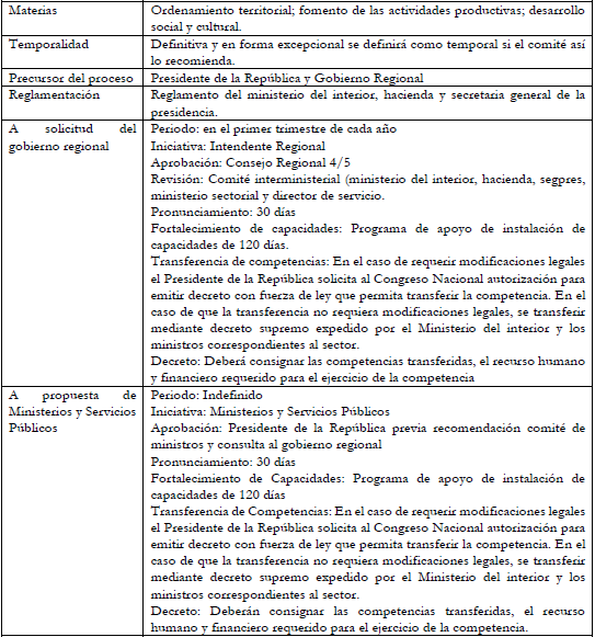 Los artículos que les siguen definen un procedimiento reglado, en el que participan los gobiernos regionales, no sólo como demandantes de competencias, sino también, como actores de veto para la transferencia de competencias, ello en el caso de las propuestas que realice el Presidente de la República o modificaciones propuestas por el Comité Interministerial de Descentralización.