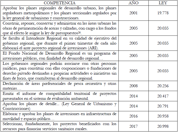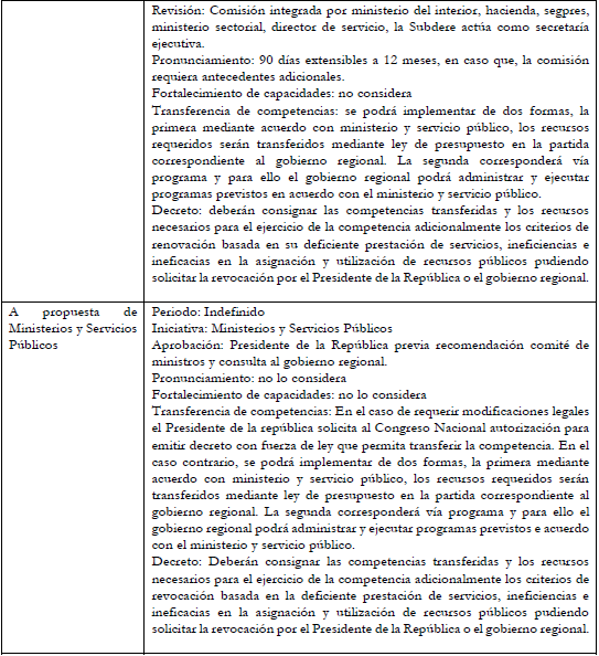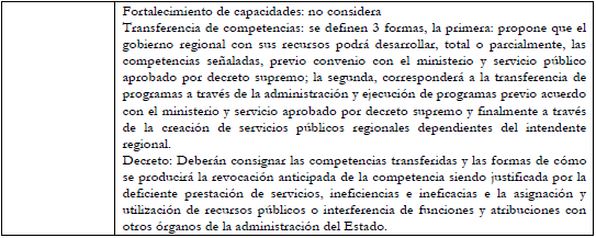 El modelo definido en la norma permitía a los gobiernos regionales solicitar la transferencia de competencias y recursos en el sentido de avanzar en el proceso de descentralización, sin embargo, el articulado presentado en 1992 no definió un procedimiento aplicable con posterioridad a la consideración del Presidente de la República de la solicitud de transferencia de competencia. En tal situación, es dable entender que en el caso de considerar admisible tal iniciativa, ello se debería traducir en el envío de un proyecto de ley al Congreso Nacional por el Presidente de la República en el ejercicio de sus atribuciones. En el periodo 1993 a 2006 no se identifican solicitudes provenientes de los gobiernos regionales, pero si se pueden encontrar competencias transferidas por iniciativa del Presidente de la República mediante modificaciones de la ley 19.175 y otros cuerpos legales (ver tabla N°1).