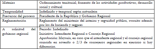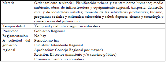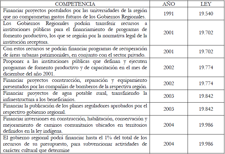 Es importante señalar entonces, que si bien, las competencias transferidas en la ley de presupuestos son eminentemente temporales y su vigencia es de un año, estará vigente en tanto sea considerada en leyes de presupuestos posteriores. La naturaleza de las competencias consignadas en la ley de presupuestos corresponde principalmente a materias del tipo financiero y relacionado con el destino y uso de los recursos. A modo de ejemplo, antes del año 2003 el gobierno regional no podría haber financiado proyectos de agua potable rural y transferir dicha infraestructura a sus beneficiarios como se especificó en la ley 19.842 como se puede observar en la tabla N°2, lo mismo sucedía con el financiamiento de la publicación de los planes reguladores comunales aprobados por el gobierno regional. Es la ley de presupuestos, el principal instrumento de transferencia de competencias aumentando la autonomía administrativa del gobierno regional y a su vez, es el principal instrumento que promueve la descentralización fiscal.