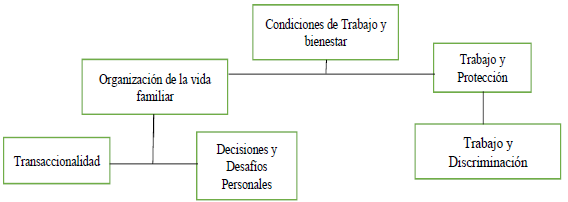 Condiciones de Trabajo y Bienestar constituye la categoría principal, se vincula con los efectos de las condiciones de trabajo en el bienestar individual y familiar